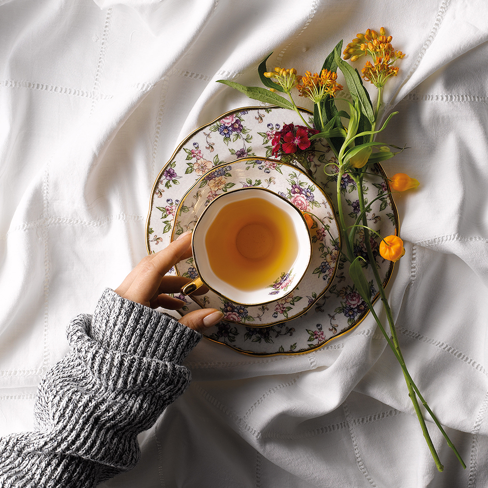 The 3 piece fine bone china set includes a Teacup, Tea Saucer and 20cm Plate.